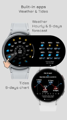 Verder verrijkt **Marine Captain** uw ervaring met ingebouwde mini-apps voor gedetailleerde weers- en getijdenoverzichten tot zes dagen. Ervaar extra gemak met een uurlijkse meldingsfunctie (met geluid en trilling) en de mogelijkheid om complicaties van derden te integreren. Een belangrijke opmerking: alle functies en complicaties van de wijzerplaat zijn gratis beschikbaar; de premium licentie verwijdert uitsluitend het 'Free Version' watermerk. Voor een optimale werking vereist **Marine Captain** een smartwatch met Wear OS 4.0 of hoger, en een mobiel apparaat met Android 13 of hoger voor de telefoonapp.
