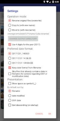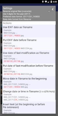 De precisie gaat verder dan alleen hernoemen. U heeft de volledige controle over het uitvoerformaat van de datum, van een compacte 'JJJJMMdd_HHmmss' tot een meer uitgebreide 'JJJJ-MM-dd HH.mm.ss', en u kunt zelfs het jaar met twee of vier cijfers laten weergeven. Voor maximale personalisatie kunt u nu, met de nieuwe functie in versie 1.10.0, uw eigen datumpatronen definiëren. Heeft u bestanden met generieke namen zoals "CIMG1234.jpg" of "DSC-1234.jpg"? Deze applicatie kan ze intelligent hernoemen met de EXIF-datum of de aanwezige modificatiedatum. Zelfs verkeerd ingevoerde datums in bestandsnamen kunnen eenvoudig worden gecorrigeerd door dagen, uren, minuten en/of seconden toe te voegen of af te trekken. De ondersteuning voor diverse formaten zoals jpg/jpeg, png, gif, mp4, mov, avi en 3gp, samen met schrijftoegang tot externe SD-kaarten, garandeert een brede compatibiliteit.