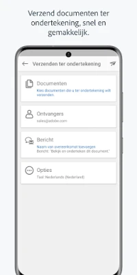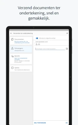 Met Adobe Acrobat Sign bent u niet langer gebonden aan een bureau. Open documenten direct en zet uw handtekening met een vinger of stylus op het scherm, of keur met een simpele tik goed. Delegeer ondertekeningsverzoeken naar een collega of sla onvolledige formulieren op om ze op een later moment af te ronden, precies wanneer het u uitkomt. Vraag bovendien eenvoudig elektronische handtekeningen op: verstuur documenten vanuit uw cloudopslag (Google Drive, Box, Dropbox, Adobe Document Cloud) of als e-mailbijlage. Voor persoonlijke interacties kunt u zelfs direct ter plaatse handtekeningen verzamelen en de taal voor de ondertekenaar instellen, wat een naadloze ervaring voor iedereen garandeert.