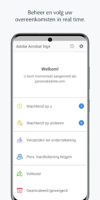 Met Adobe Acrobat Sign ondertekent u documenten en formulieren elektronisch, eenvoudig, veilig en overal. Deze mobiele assistent van Adobe maakt het versturen en volgen van documenten moeiteloos, versnellend bedrijfsprocessen met vertrouwde e-handtekeningen.