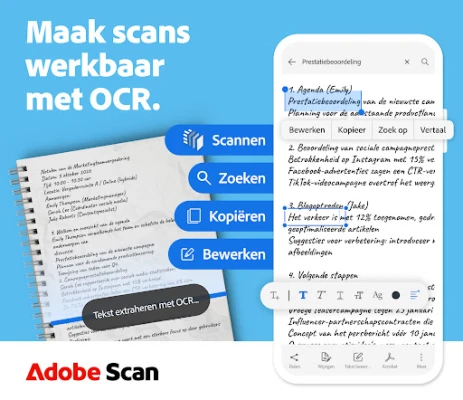 De veelzijdigheid van Adobe Scan stelt je in staat om elk fysiek document moeiteloos te digitaliseren. Of het nu gaat om bonnen, aantekeningen, visitekaartjes of omvangrijke rapporten, verander ze direct in heldere PDF- of JPEG-bestanden. Bespaar kostbare tijd met snelle scanfuncties die complete papierstapels in een oogwenk omzetten. Bovendien transformeert de geavanceerde OCR-technologie gescande tekst in doorzoekbare en bewerkbare content, waardoor je eenvoudig informatie kunt vinden en hergebruiken zonder opnieuw te typen.