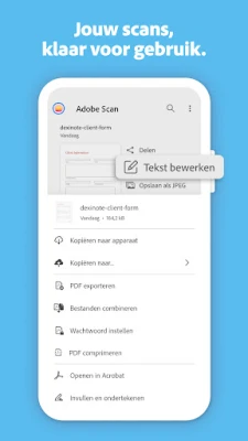 Verfijn je digitale documenten met de krachtige bewerkingsmogelijkheden van Adobe Scan. Snijd scans bij, roteer ze, pas kleuren aan en optimaliseer helderheid en contrast met enkele tikken. De unieke opschoonfunctie verwijdert onvolkomenheden zoals vlekken, vouwen en zelfs handschrift, voor een vlekkeloze presentatie. Organiseer je bestanden moeiteloos in aangepaste mappen en laat de app contactgegevens van visitekaartjes automatisch toevoegen aan je telefoon. Dankzij de naadloze integratie met Adobe Acrobat Reader kun je je scans verder bewerken, van aantekeningen maken tot formulieren invullen en ondertekenen, en deze veilig delen via verschillende platforms.