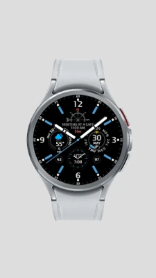 Verken de Marine Captain Watch Face voor Wear OS. Deze wijzerplaat beschikt over 6 aanpasbare slots voor complicaties, verdeeld over 3 posities: links, rechts en onder. Elke positie toont dynamisch 2 complicaties die met elkaar afwisselen.