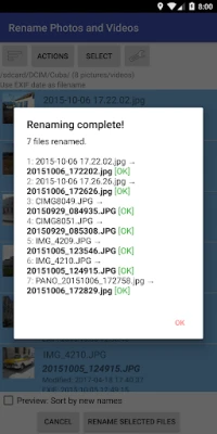 De precisie gaat verder dan alleen hernoemen. U heeft de volledige controle over het uitvoerformaat van de datum, van een compacte 'JJJJMMdd_HHmmss' tot een meer uitgebreide 'JJJJ-MM-dd HH.mm.ss', en u kunt zelfs het jaar met twee of vier cijfers laten weergeven. Voor maximale personalisatie kunt u nu, met de nieuwe functie in versie 1.10.0, uw eigen datumpatronen definiëren. Heeft u bestanden met generieke namen zoals "CIMG1234.jpg" of "DSC-1234.jpg"? Deze applicatie kan ze intelligent hernoemen met de EXIF-datum of de aanwezige modificatiedatum. Zelfs verkeerd ingevoerde datums in bestandsnamen kunnen eenvoudig worden gecorrigeerd door dagen, uren, minuten en/of seconden toe te voegen of af te trekken. De ondersteuning voor diverse formaten zoals jpg/jpeg, png, gif, mp4, mov, avi en 3gp, samen met schrijftoegang tot externe SD-kaarten, garandeert een brede compatibiliteit.